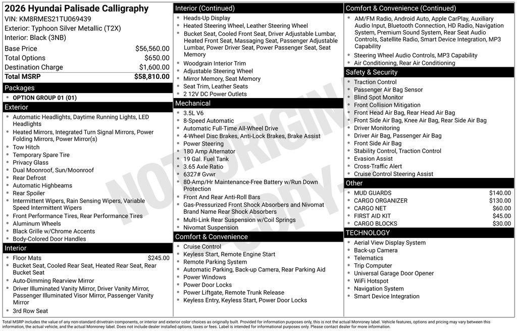 Typhoon Silver Metallic 2026 Hyundai Palisade Calligraphy AWD 8-Speed Automatic V6 Price includes: $1000 - Sales Event Cash. Exp. 03/02/2026 $750 - Hyundai HMF Dealer Choice : $750 discount and 5.39% APR for 24 months. $44.05 per $1000 financed. Available to well qualified buyers who finance through Hyundai Motor Finance. H704. Exp. 03/02/2026