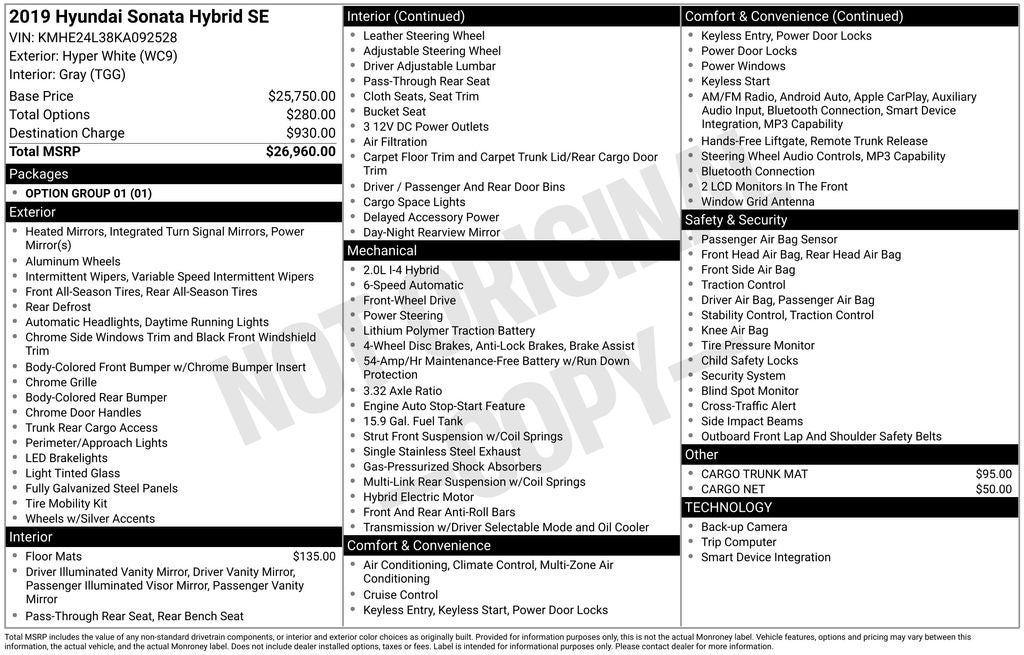 This online window sticker is provided for informational purposes only. Vehicle features, options, pricing and other information are subject to change. See your Hyundai dealer and the Monroney label affixed to the actual vehicle for the most up-to-date specifications and information.