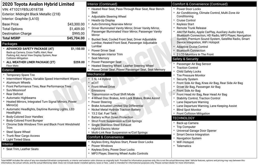 2020 Toyota AVALON HYBRID Limited