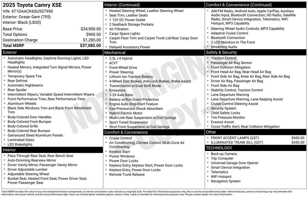 Ocean Gem XSE FWD eCVT 2.5L 4-Cylinder 16V DOHC Back Up Camera, Bluetooth®, Clean History Report, Leather Seat Trim, Alloy Wheels, Audio Controls on the Steering Wheel, Blind Zone Monitoring, Dual Climate Control, Premium Heated Leather Seats, Proximity Keyless Entry, Push Button Start, Rear View Camera, Satellite Radio, Side Air Bags, a Clean Carfax, 2.5L 4-Cylinder 16V DOHC, Black w/Leather Seat Trim, 4-Wheel Disc Brakes, AM/FM radio: SiriusXM, Apple CarPlay/Android Auto, Auto High-beam Headlights, Brake assist, Electronic Stability Control, Emergency communication system: Safety Connect (up to 10-year trial subscription), Exterior Parking Camera Rear, Front Accent Lighting (TMS), Front anti-roll bar, Front Center Armrest, Front dual zone A/C, Fully automatic headlights, Heated door mirrors, Heated Front Bucket Seats, Heated front seats, Heated steering wheel, Illuminated Trunk Sill (TMS), Knee airbag, Leather Seat Trim, Outside temperature display, Power driver seat, Power passenger seat, Radio: Toyota Audio Multimedia w/12.3 Touchscreen, Rear reading lights, Rear window defroster, Split folding rear seat, Steering wheel mounted audio controls, Telescoping steering wheel, Trip computer, Turn signal indicator mirrors, Wheels: 19 Smoke Gray & Black-Finished Alloy.