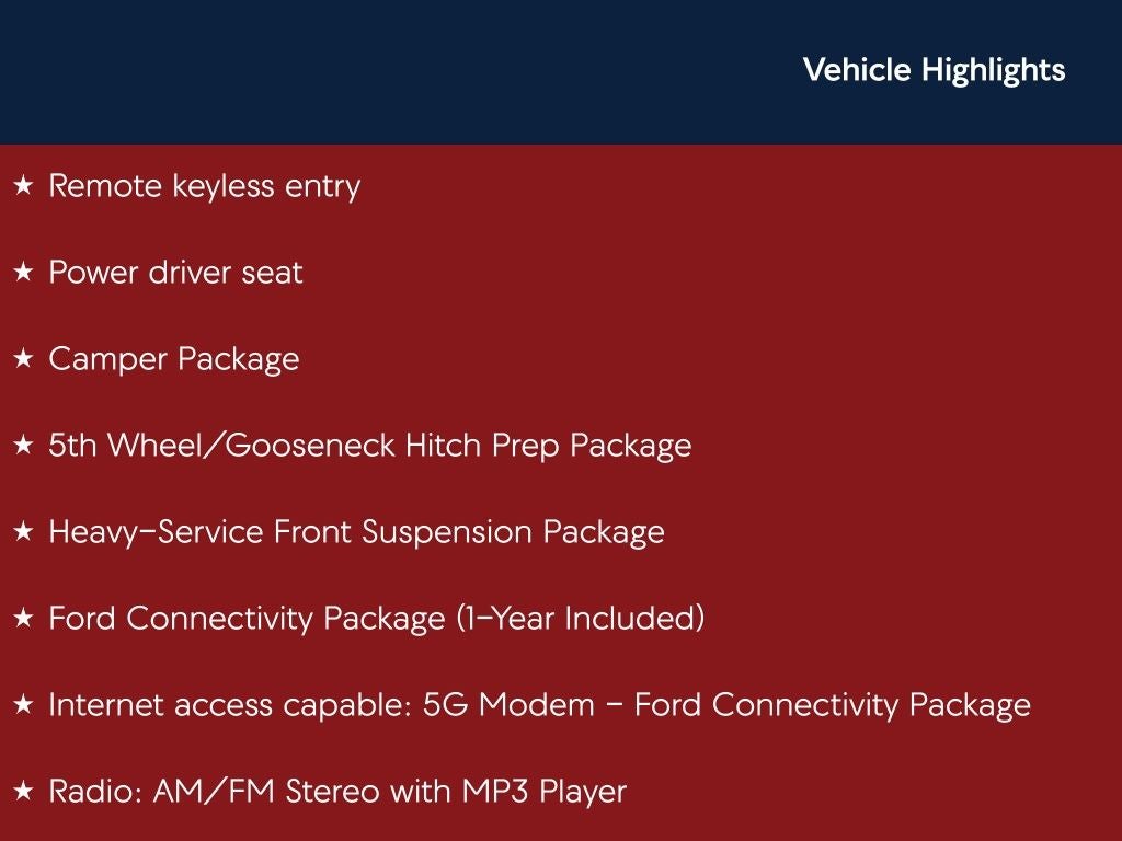 Agate Black Metallic XLT 4WD 10-Speed Automatic Power Stroke 6.7L V8 DI 32V OHV Turbodiesel Back Up Camera, Bluetooth®, Clean History Report, a Clean, One Owner Carfax, 4WD, 190 Amp Alternator, 3.73 Axle Ratio, 4-Wheel Disc Brakes, 5th Wheel/Gooseneck Hitch Prep Package, 6 Speakers, 6 Angular Bright Anodized Step Bars, ABS brakes, Air Conditioning, Alloy wheels, Auto High-beam Headlights, Brake assist, Camper Package, Cloth 40/20/40 Split Bench Seat, Dual AGM 68 AH Battery, Dual front impact airbags, Dual front side impact airbags, Electronic Stability Control, Emergency communication system: SYNC 4 911 Assist, Exterior Parking Camera Rear, Ford Connectivity Package (1-Year Included), Front anti-roll bar, Front Center Armrest w/Storage, Front fog lights, Fully automatic headlights, Gooseneck Hitch Kit, Heated door mirrors, Heavy-Service Front Suspension Package, Internet access capable: 5G Modem - Ford Connectivity Package, Low tire pressure warning, Overhead airbag, Passenger door bin, Power door mirrors, Power driver seat, Power steering, Privacy Glass, Radio: AM/FM Stereo with MP3 Player, Rear Stabilizer Bar and Auxiliary Springs, Rear step bumper, Remote keyless entry, Remote Start System, SecuriCode Wireless Keyless Entry Keypad, Security system, Speed control, Split folding rear seat, Steering wheel mounted audio controls, SYNC 4, Tailgate Step and Handle, Telescoping steering wheel, Tilt steering wheel, Tough Bed Spray-in Bedliner, Traction control, Turn signal indicator mirrors, Variably intermittent wipers.